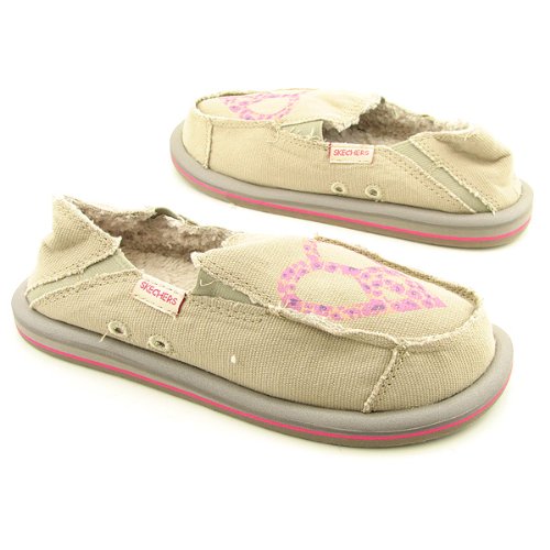 Sink your foot into the super cozy Dab flat from Skechers Cali! This cute style has a textured canvas upper with a sweet floral heart-shaped peace sign on the vamp. Its gored, elasticized sides will form to your foot when you walk with a little extra ease while its faux fur lining keeps you warm and snug.